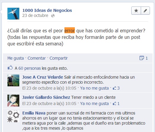 Hace algunos días solicité su colaboración a nuestros seguidores de la página de 1000 ideas de ngocios en facebook para que aportaran, de acuerdo a su experiencia lo que ellos dirían que ha sido “su peor error al emprender“.